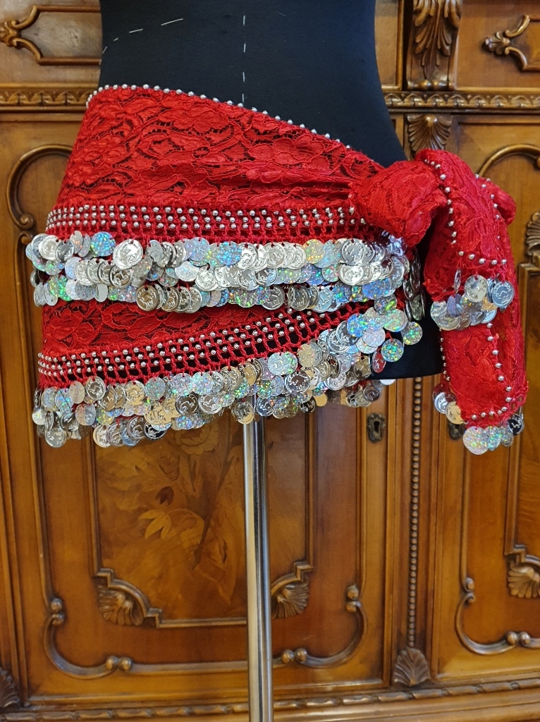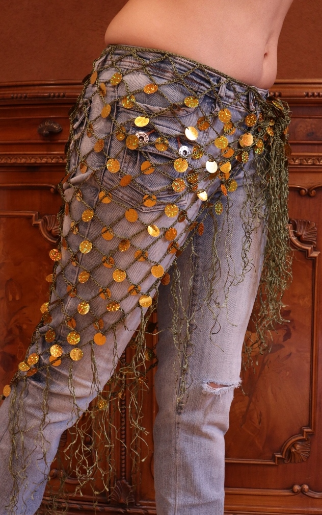 Pärlite ja hõbemüntidega, heegeldatud puusavöö